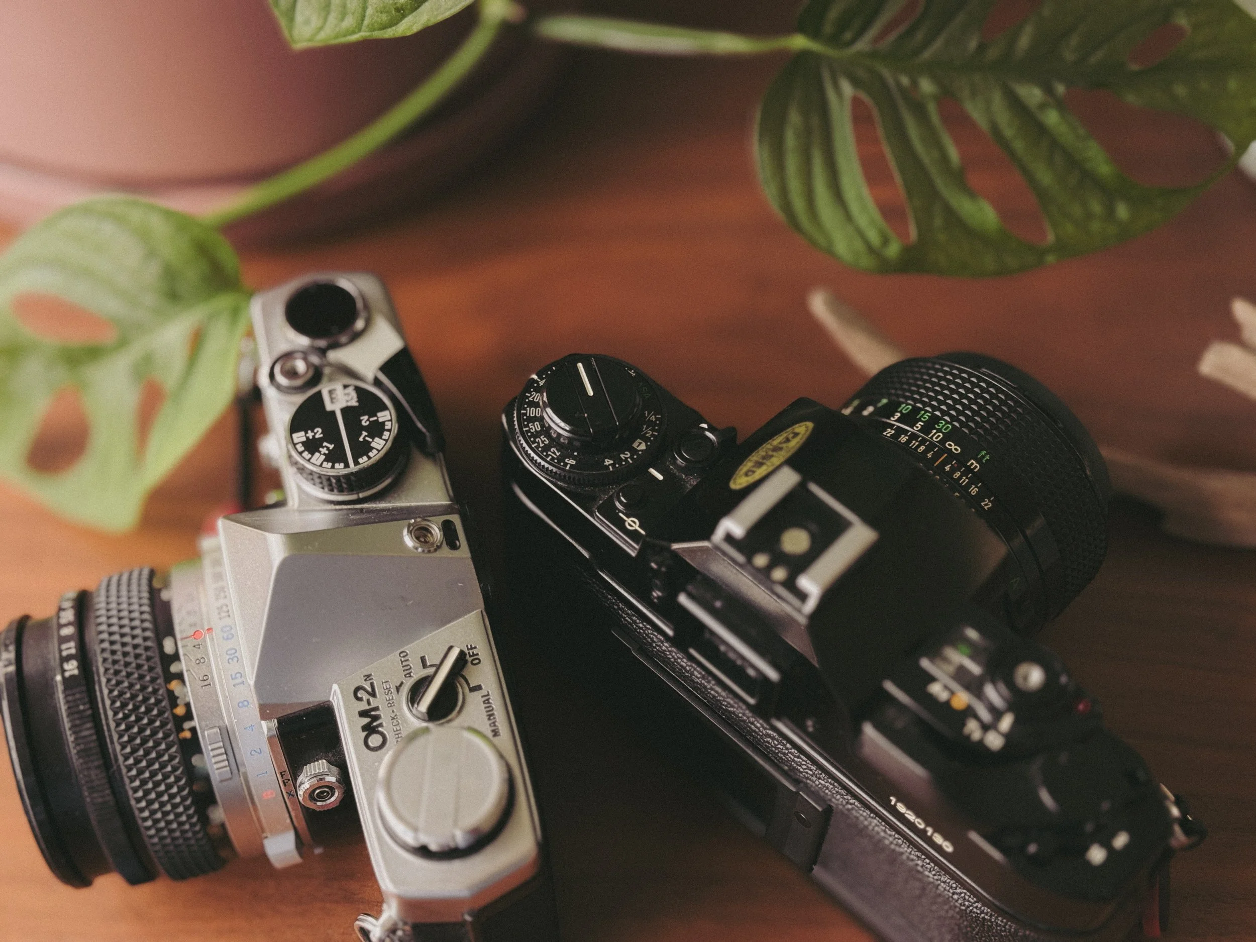In the photo on the left, you’ll see two different film cameras with exposure compensation dials. The OM-2n on the left has the dial between the prism and the film advance lever and ranges from -2 - +2. The Canon A-1 on the right has the exposure compensation dial on the left of the body (when holding it) connected to the ISO dial and under the rewind knob. It ranges from -1/4 - +4.